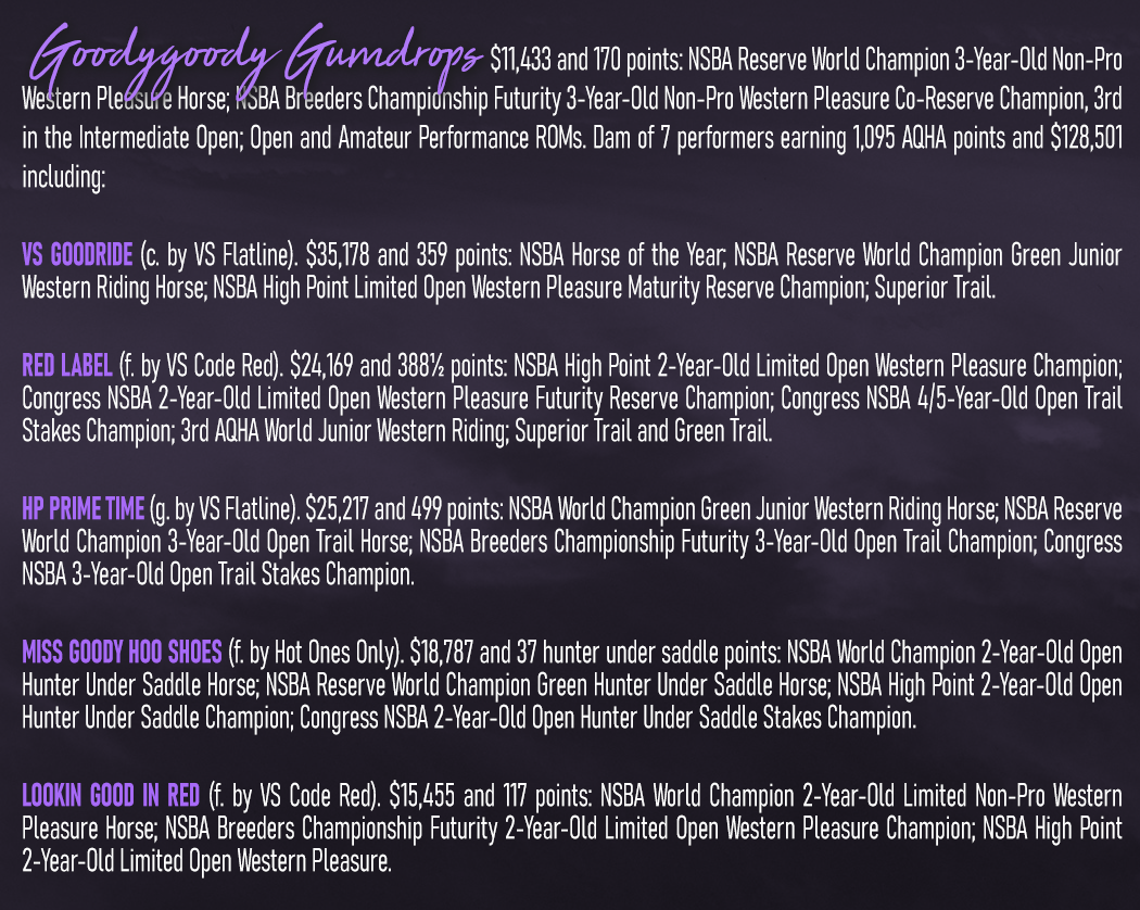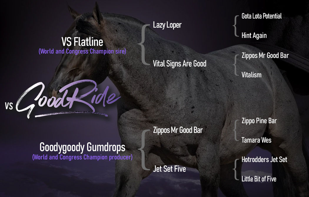 ![]() HOW BOUT A GOODRIDE Multiple APHA World Champion | NSBA Reserve World Champion | LTE: $26,000+ ![]() THE WAY I TALK Futurity Champion & Reserve Champion | AQHA High Point Top Ten | LTE: $17,000+ ![]() VS ENJOY THE RIDE Champion AQHA East Level 1 Championship | Congress Top Ten ![]() VS CODE ME ABSOLUTE Reserve Champion AQHA West Level 1 Championship ![]() GOODRIDE CLYDE Congress Top Five | Futurity Champion ![]() PIMP MY RYDE Champion AQHA East Level 1 Championship | NSBA All Around Rookie ![]() CHASING WHITE LINES 3rd Congress Maiden HUS | Reserve Futurity Champion ![]() SEEK N U SHALL RIDE Congress Top Ten | NSBA World Show Top Five ![]() THE MATERIAL GIIRL (right) Futurity Top Five | Congress Top Ten ![]() RIDEALIZED APHA World Show Stakes Champion & Reserve Champion ![]() GOODRIDES DREAM GIRL Reserve Congress Champion ![]() THE BEST RIDE Multiple Futurity Champion & Reserve Champion ![]() CERTAINLY A GOODRIDE ApHC Reserve World Champion ![]() EXTREMELY GOODRIDE Multiple Circuit Champion | Superior Western Pleasure |